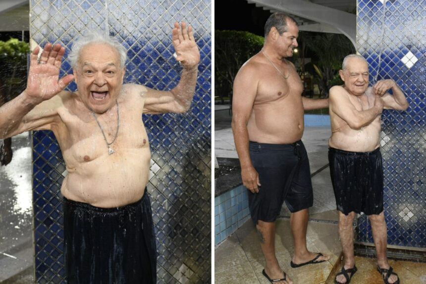 O banho foi o primeiro ato antes de Othon Bastos brilhar no palco! E quem esteve em Caldas do Jorro pode dizer que foi uma verdadeira celebração. Com 92 anos, o ator mergulhou nas águas termais como se estivesse reencontrando um amigo de longas datas.